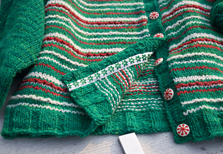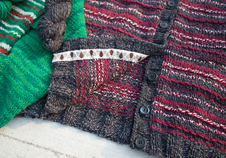 Finally, the sweater is steeked down the center of the front. Cast on includes 5 steek stitches, and you can use the method of your choice for reinforcing and cutting open the sweater. Then button bands are added from picked up stitches and you can finish the inside of the bands by hand stitching ribbon over the steek selvedge for a tidy look.