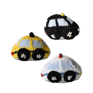 Beep! Beep! Move over, there’s a cute convoy of knitted Toy Cars coming through! These cars use short row shaping so that each can be knitted in one piece to minimise seaming. The wheels and light bars knitted separately and sewn on. The cars are in 2 sizes (9cm and 10cm long), and the colour-work creates 5 designs: a red coupe, blue saloon, white police car, New York yellow taxi and a London black cab. You could even add a toy squeaker inside the car when stuffing for extra “beep beep” fun. Designed by Amanda Berry @fluffandfuzz, the cars are knitted on single pointed needles (not in the round) in DK yarns (double knitting/light worsted).