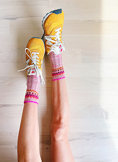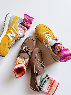 The above yardage will be needed for each of the three colorwork bands! If you choose to use different colors for your bands as shown in my sample socks, you’ll simply gather 3 different sets of colors, each using the above amounts. If you decide to stick with one set of colors for all three bands, then multiply the above numbers by 3.