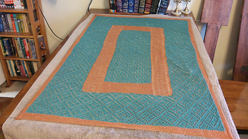 This stole features a garden theme, with the trellis pattern on the outside edge and diamond ladders framing the floral mesh pattern in the center. The different colors separate the patterns. This handspun lace-weight qiviut yarn has a lovely transparent look. Working with color changes was a bit of a challenge, but the results are well worth the effort!