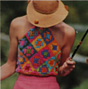 From the pattern: “Scarf-shaped halter has 21 colorful granny square motifs sewn together to form a triangle. Top motif is turned under and tacked to hold the halter chain that ties at the back of the neck. Bottom edge is filled out with 2 rows of shells.”