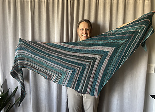 Tribbia is an asymmetrical triangular shawl. Knitting begins at the top corner. Shawl shaping is done on every right side row and increases are worked on wrong side rows until the intended size is achieved. The pattern is perfect for left overs or a set of miniskeins. Lace knitting only on the right side rows and only one lace pattern used throughout. Continuous stitch pattern and color changes make this shawl a project you don’t want to put down!