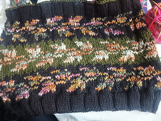This multi-coloured alpaca yarn from my stash needed the right pattern to set it off, and this 17th century foliage motif was just the thing. Set on a dark green background, these leaves pass back and forth around the circumference of this cowl to create a colourful parade of autumnal colour. Trusa is Old English for fallen leaves.