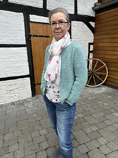 Jedes Garn das zur Maschenprobe passt – Aran (ca. 70-80m per 50g) oder mehrere dünne Fäden zusammengenommen. Ich empfehle ein weiches Material, das auch auf der linken Seite schön eben aussieht, damit die Jacke gewendet werden kann (klick für Inspiration). Siehe Seite 2 für Garnmengen.
