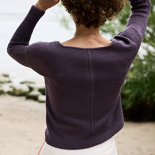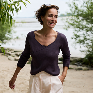 For Twilight Trail, you knit the individual parts of the body flat, starting with the back panel worked bottom up, with a refined cross-stitch motif running vertically down the centre of the back. The two front panels are also worked bottom up, with I-Cord edges along the shaping lines, which are later continued around the back neckline. German short rows are used at the shoulders to achieve an improved fit, and the panels are joined to the back using Russian grafting. The side seams are finished with a mattress stitch. Placing the two front pieces on top of each other creates the exciting wrap look. For the sleeves, you pick up stitches around the arm openings and knit them in rounds directly onto the body, ending with extended 1x1 ribbed cuffs that echo the cross-stitch detail on the back panel.