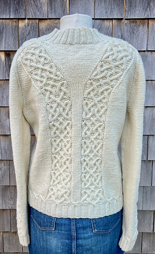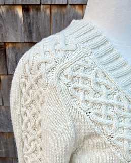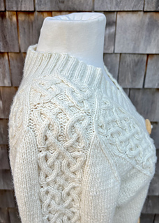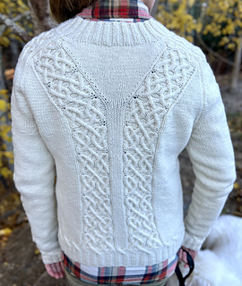 A V-neck cabled cardigan is a time-honored classic. This one balances a striking original cable with wide sections of stockinette for ease of knitting and ease of wear. The undyed merino wool is soft and strong and goes with everything. It features some lovely embellishments like a pretty cabled transition from ribbing to stockinette and a V design on the back to mirror the front. The cabled saddle shoulder adds some structure to a soft yarn, making for easy sizing as there is no hard seam to line up with the edge of your shoulder. This cardigan is worked flat, bottom up and has a set-in sleeve.