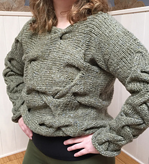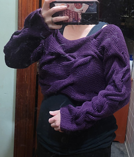 The sweater is worked from side to side, starting with right sleeve. The sleeve is worked in rounds silmultaneously repeating the cable pattern with the middle stitches and increasing at the beginning and end of round. When reaching the armpit, stitches for the back are cast on at the end of the last round. The work is turned and purled flat to the stitches cast on at the end of last round and they are purled through the back loop to form the stitches for the front. A couple rows are worked flat for shoulder. Then sts are divided in two, half become the back and the other half become the front. The front is worked first witt chest cables while the back sts are left on hold. Once both back and front are knitted, they join to become the left shoulder and later the left sleeve, which is worked in the round with cable in the middle and decreases on both sides.