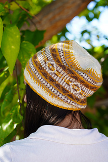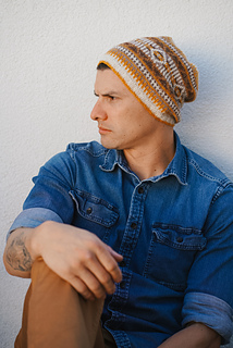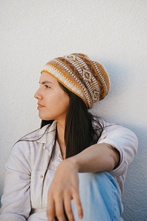 My brother and I are often mistaken for twins, each in a different color story: one in warm tones, one in cool. This pattern celebrates balance and connection — two worlds that mirror each other, just like us. Using finer yarn allowed me to craft intricate motifs and a variety of shapes, inspired by Navajo patterns and their mirrored, repeating designs. I’m so happy with how this beanie turned out, especially in the lovely neutral tones from the Purl Soho Linen Quill collection. The warm and cool versions are inspired by the stunning temperature shifts found in the desert, capturing that beautiful contrast where day meets night.
