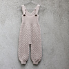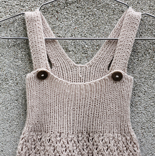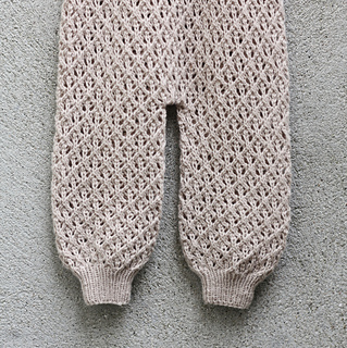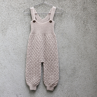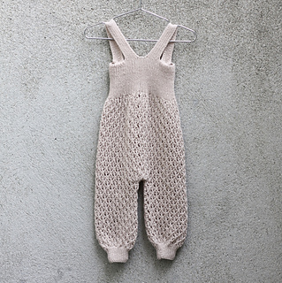 You start working each leg separately in the round before both legs are joined on the same needle at the crotch. The back body is shaped with short rows to make room for the diaper. The suit is finished with a ribbed body and two straps that are shaped with short rows.