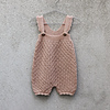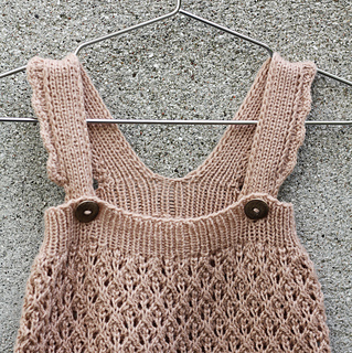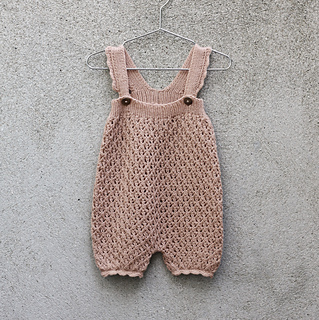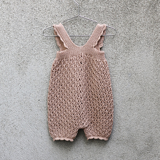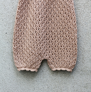 You start working each leg separately in the round before both legs are joined on the same needle at the crotch. The back body is shaped with short rows to make room for the diaper. The body is finished with a ribbed edge and two straps. Scalloped edges finish the leg cuffs and the outer edges of both straps.