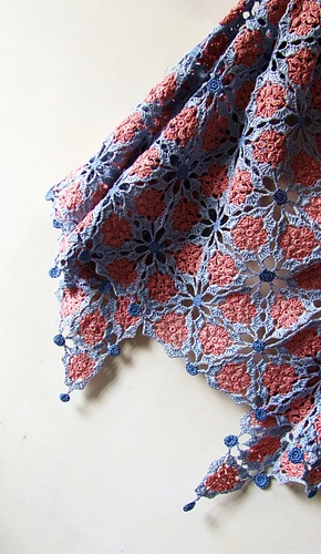 Under The Moon is a trapezium-shaped shawl made of join-as-you-go motifs.