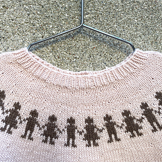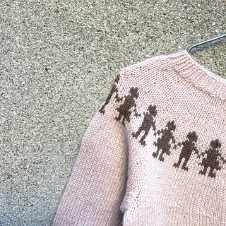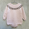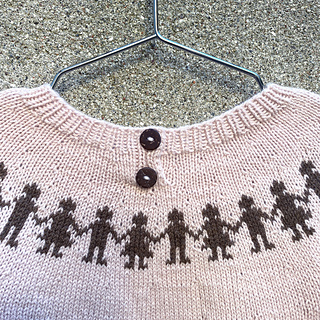Unicef Romper is worked from the top down, has a circular yoke construction and a charted Fair Isle pattern of children holding hands around the yoke. You start working back and forth to create the split at back neck, continue in the round for the yoke and body before working back and forth again for front and back crotch. The romper is shaped with German short rows at the underarms and lower back. Stitches are picked up for the edges along the leg openings and button bands. The romper is worked using 1 strand of Merino in two contrasting colorways. The crotch and back neck split are closed with buttons.