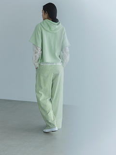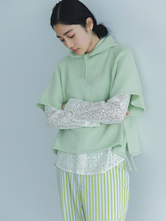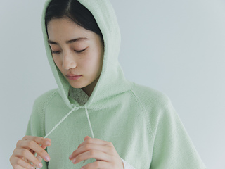 均一できめ細やかな肌触りのよいランブイエメリノウールで編む、スウェット感覚でラフに着ていただけるパーカーベスト。裾とパーカー部分にひもを通す本格的な仕上がりです。立体的なフードやくるんと丸まった袖にもこだわりました。
