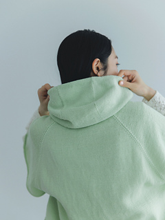 フードは左右前頭部から頭頂に向かって分散増減しながら編んでいきます。フード端の部分を裏側に折りたたんでかがってひも通しを作ります。身頃と袖をつなぎ、続いてフードを重ねてつなげて仕上げます。