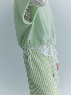 前後別々に裾から別鎖の作り目で編み始め、数段編んだら別鎖をほどいて裏側に折り返し、目を重ねて一緒に編んでひも通しを作ります。続いてメリヤス編みを編み、ラグラン線で減目をして目を休めます。袖は共鎖の作り目を編み、数段編んだら1段のみ1目ゴム編みを編みます。こうすることで、くるんと丸まった袖をここで押さえることができます。