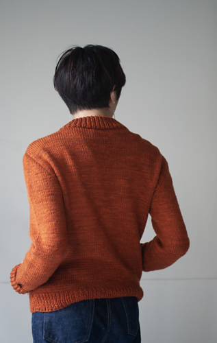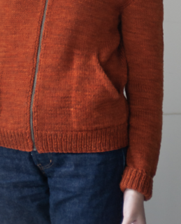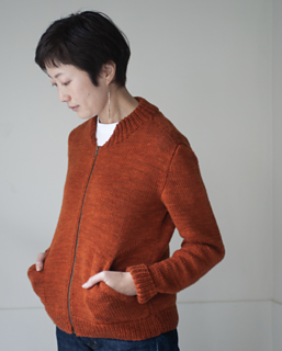 後ろ身頃 , 前身頃をそれぞれ編み , 綴じはぎする . ポケットは引き返しを用い斜めにしている . 袖を編み , 身頃に綴じ付ける . ジッパーを 付けるために前立てを細編みで編み , 襟は引き返しをしながらダブ ルに編む.