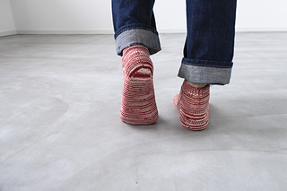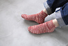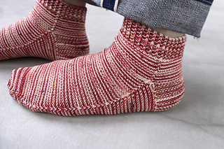カフダウンで編むリバーシブルの靴下. 表側はシンプルなメリヤス編みの靴下, 裏はサイドにねじり目のラインが入った靴下になる. ヒールフラップとつま先はガーター編みで編む .