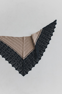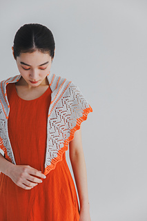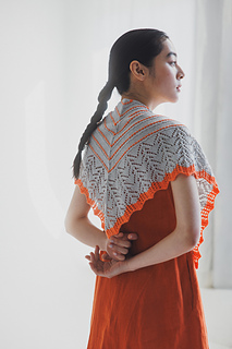 外側のスカラップレース部分から中心に向かって編み始めます。レース部分を編み終えたらメリヤスとすべり目、裏目を組み合わせたライン部分を編みます。透けないマットな部分とレース編み部分とのコントラストが美しいショールです。