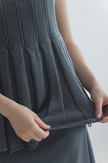 裾側から輪で編み始めます。身頃下のプリーツ部分は表目とガーター編みを組み合わせて凹凸を出しています。編み進むにつれて針の号数を徐々に小さく調整します。こうすることで、スカートのように裾に向かって広がった編み地になります。