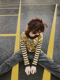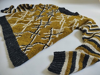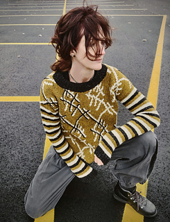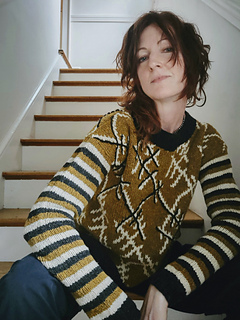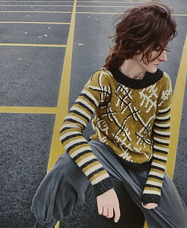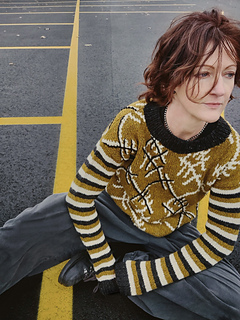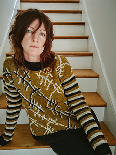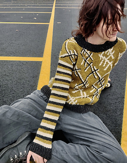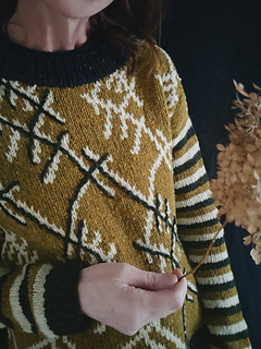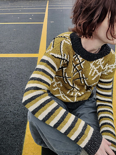 Uri is a drop shoulder constructed pullover knit from the bottom up. The body is knit in the round to the underarm then separated and knit flat, in front and back pieces, to the shoulders. Shoulders are seamed then stitches picked up around the armholes. Sleeves are knit in the round to the cuff. The fit of the body is oversized and boxy, the sleeves are designed to fit closer to body dimensions. A stranded colorwork design is worked on the front and back of the sweater. A striped pattern is used on the sleeves. A linear embroidered detail is added upon completion of the sweater.