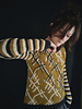 This design was based on random marks, scribbles and doodles. The overlapping lines form a bold large scale design. Variety is added through a line weight shift in the embroidered element and thick bands of stripes on the sleeves.