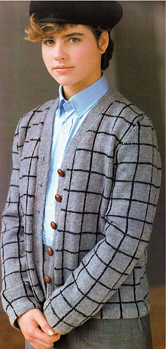 Stocking stitch cardigan with knitted horizontal check line, crochet vertical line, hemmed cuffs and lower edges and set-in sleeves.