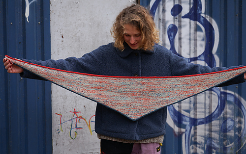 A simple triangle shawl in garter stitch yet with a particular construction. Just like in variations on the same themes, small differences in the same construction produce five types of triangles, from a classical right-angled triangle to an extremely shallow one. The pattern also provides instructions for a ruffled border, striped color work, as well as those for making a hole to cross the tips.