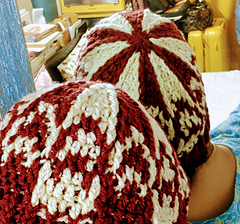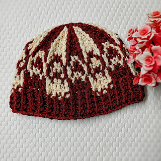 A top down beanie in two colors using post stitches to create a heart motif , is quick to finish !
