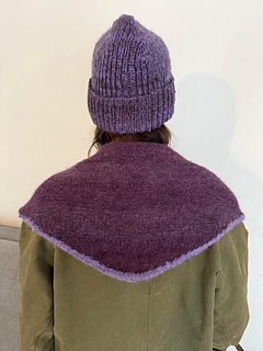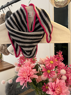 The VERSA shawl is the perfectly shaped triangular shawl with horizontal stripes. It is knit from the bottom up, starting at the apex and working toward the longest side, in an all-over four-row stripe pattern. All three sides of the triangular shawl are finished with a tubular edge in a contrasting highlight color.
