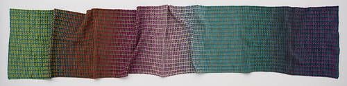 The yarns are from three North American dyers: Freia Fine Handpaints, Gauge Dye Works, and Spincycle Yarns. Each company uses different approaches to creating long-repeat yarns: Freia Fine Handpaints make long, smooth transitions from one solid color to another. Gauge Dye Works is famous for their precision color changes to create remarkable stripes. Spincycle Yarns create moving plys: each ply changes independently so the yarns are moving marls.