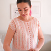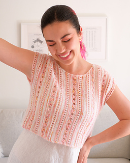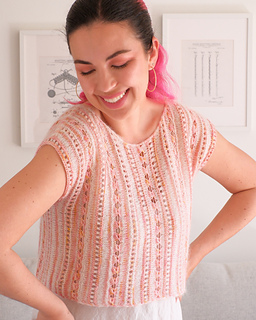 The tee is knit sideways and can be worked in any number of colors. Vertical stripes, lots of lace, built-in i-cord finishes, comfortably shaped shoulders, boat neck, and simple straight silhouette make Vesna a perfect spring / summer project. Choose from 13 chest circumferences and 6 lengths to make a piece that feels truly yours!