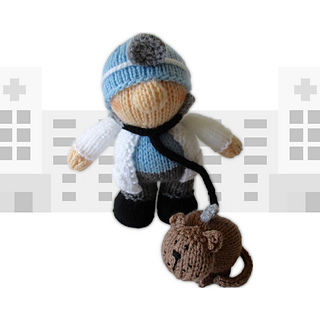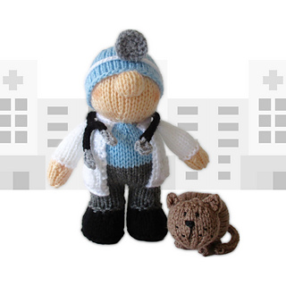 Victor the Veterinary takes care of your pets, and today a cat is having their check up. Designed by Amanda Berry @fluffandfuzz, these toys are knitted in acrylic DK yarns. Work most pieces flat (back and forth) on single pointed knitting needles, not in the round. The DPNs are used to knit i-cord tubes for the stethoscope and cat’s tail and legs. Victor’s head mirror strap is a single crochet chain worked on a crochet hook.