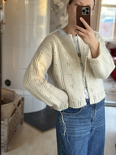 This cardigan is designed to have an oversized fit and is intended to be worn with approximately 10–15 cm / 4–6” of positive ease at the bust.