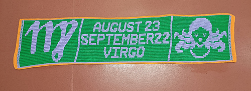 Any yarn weight or brand can be used to crochet Virgo - when made with DK weight yarn, the finished piece measures approximately 126 x 31cm (50 x 13 inches). The amount of yarn used (when tested with DK weight yarn) is approximately 550 grams (21 ounces) or 1374 metres (1502 yards), with the main colour requiring 350 grams (13 ounces) or 874 metres (956 yards), and the contrast colour using 200 grams (8 ounces) or 500 metres (546 yards).