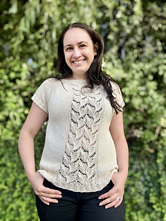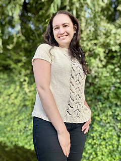 Este top se teje sin costuras, de manera circular desde arriba hacia abajo, comenzando por un canesú circular con mangas raglán. El calado del delantero nace en el canesú y se mantiene a lo largo del cuerpo, convirtiéndose en el elemento central del diseño. Las mangas son cortas y terminan con un puño tejido en elástico doble, aportando un acabado prolijo y cómodo. El cuerpo finaliza también con un elástico que entrega estructura sin restar fluidez.