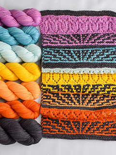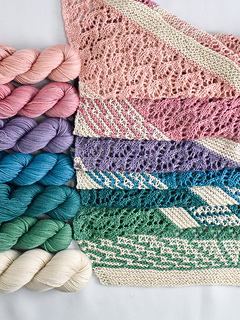 The Basílica de la Sagrada Família in Barcelona is breathtaking in its structure and intricate facade, but entering the church is an otherworldly experience. Rays of light through stained glass windows transform the stone archways into a riotous rainbow of colors. Inspired by the Gaudí masterpiece, this wrap combines structure with ornate beauty. Bold colors use slipped stitches to create mosaic rays while only knitting one color at a time. These rays spread color through the dark MC, opening into gothic archways of flowing lace, transformed by bold and beautiful colors. Choose a gradient or rainbow with strong contrast with the MC to create your own dramatic Vistosa wrap.
