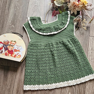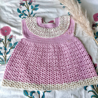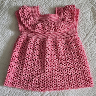 To finish it off, a row of surface-crocheted double crochet V-stitches is added into the third loop of row 6, forming the base of the yoke ruffle. From there, the same lace pattern is used to create the rest of the ruffle, adding that perfect finishing touch. This classic dress makes a lovely handmade gift, a special occasion piece, or simply a “just because she wants to feel pretty” dress for your little one.