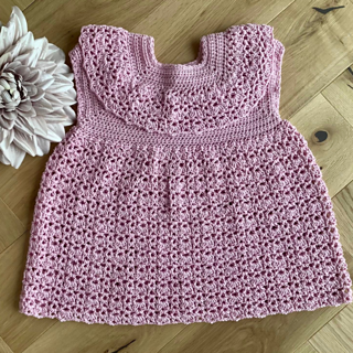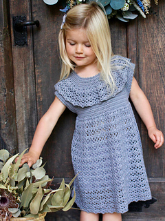 The dress is worked from the top down, beginning with a yoke made in half double crochet stitches. The sleeves are then separated to create armholes, and after a couple of rows on the body, the skirt section begins. The skirt features a simple but beautiful combination of cluster V-stitches and double crochets—an easy pattern that’s so satisfying to stitch.