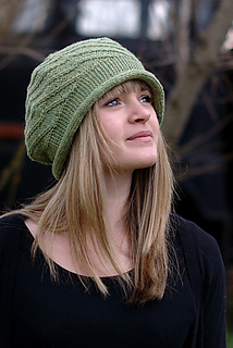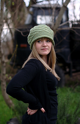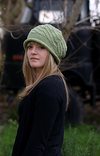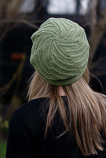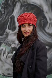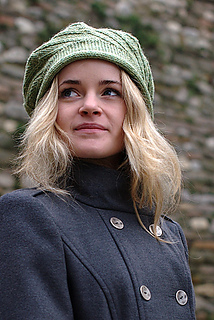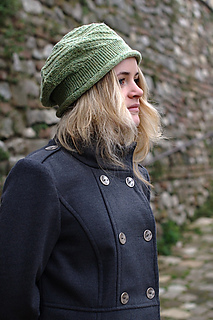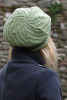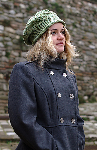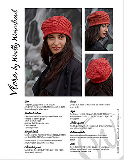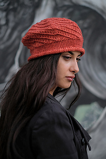 Vlora is a modern brimmed beret knit sideways on straight needles, and suits a wide range of people. The gentle swirls use a simple cable twist technique which add interest to the softly slouchy body.