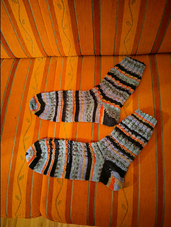 Garn: Sockengarn 4-fädig doppelt gehalten. Du brauchst mindestens zwei verschiedene Farben. Schön ist es, wenn du für Ferse und Spitze die Farbe(n) wechselst. Du kannst auch mit deinen Resten stricken, das macht tolle Effekte.