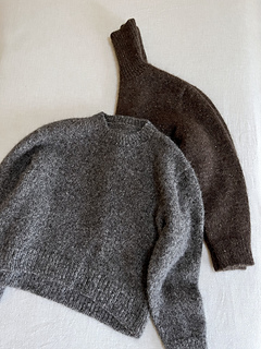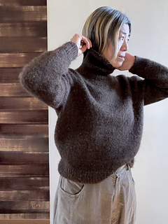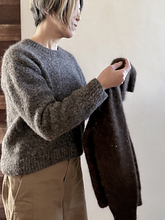 This sweater is knit top down. Start from the back shoulder, and pick up stitches from the shoulder slopes for the front shoulders and the neckline. Later, the yoke becomes a hybrid of creating sleeve caps from the front body and continuing usual body stitch increases at the same time to make this part of the sweater seamless. After separating the sleeves and the body, continue knitting each parts. Finally pickup stitches for the collar.