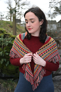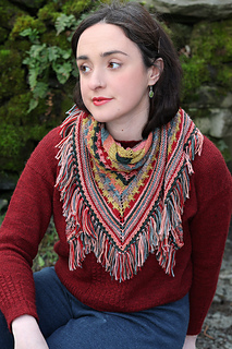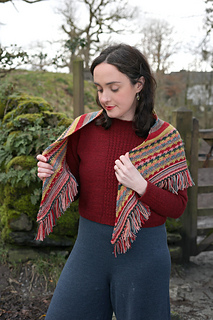 Weatherhouse is a simple triangular shawl featuring a bold, striped pattern and striking fringing. It is fashionably small in size and is easy-to-wear in a variety of ways, making it an incredibly useful addition to your hand-knitted wardrobe.
