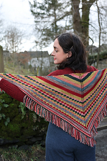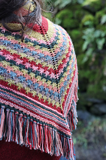 Weatherhouse commences with a garter tab and is worked from the centre top with increases at either side of the spine and the side edges. After stocking stitch stripes are worked, an eye-catching striped slip-stitch pattern follows and, finally, a striped garter stitch border. For added impact, multi-coloured tassels are added along the border edging. The shawl uses only 25g of each of the seven shades of sock yarn, making it a great way of using up small amounts of yarn. A much larger version can easily be knitted by simply doubling the depth of the initial striped section.