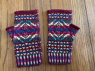 Westport Isle Mitts are knit in the round as either a full mitten or fingerless mitts to match the Westport Isle hats. The mitts come in three sizes and will fit most teens and adults.