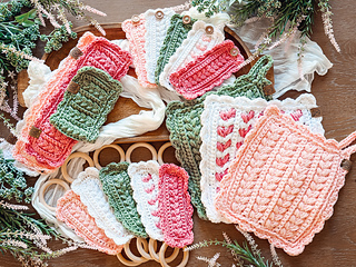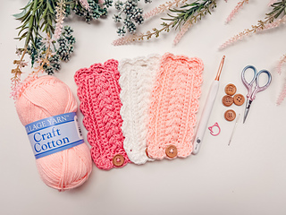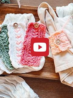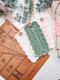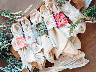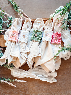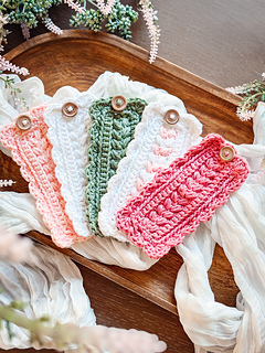 The napkin ring is worked flat in rows using my signature Wheat Stitch™, creating a beautifully textured rectangle that looks polished and elevated (even though it’s super simple to stitch). Once the body is complete, you’ll crochet a clean edging evenly around the entire piece, adding the buttonhole space as you go for an easy, functional closure. A final (and optional) round of scalloped stitches gives the napkin ring that decorative edge—soft, charming, and just the right amount of extra.