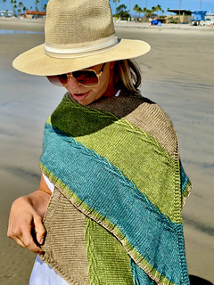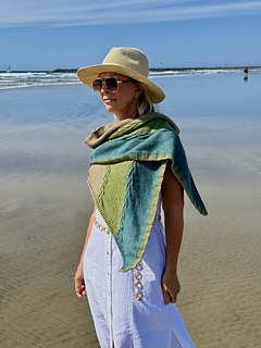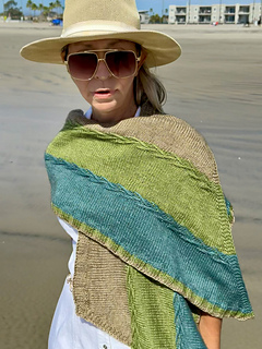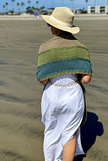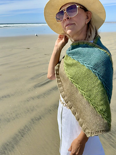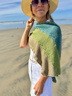 Where Sand Meets Sea is a DK-weight wrap inspired by the meeting of shore and tide, where color and motion drift quietly together. Knit in three harmonious shades, it opens with a softly sculpted ribbed edge, then glides into smooth stockinette that lets the yarn fall in gentle folds. A slipped-stitch wave carries the colors from one into the next, echoing the way tides blur the boundary between shoreline and sea.
