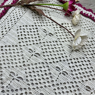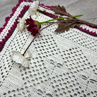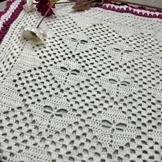 A small square shaped blanket that combines the classic granny stitch with my signature dragonflies. Built around a 12-row repeat, it features a tulip border with subtle colour accents. The pattern is easy to follow, with a small attention point along the border, making it suitable for crocheters at the easy/intermediate level.