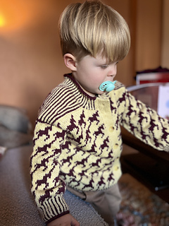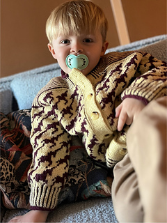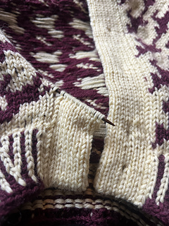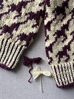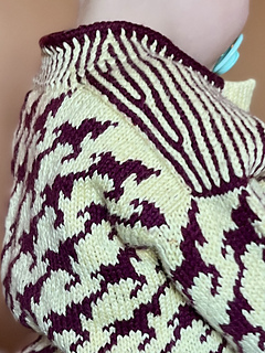 Wild Horses Cardigan is worked from the top down with saddle shoulders and set-in sleeves. First, the shoulder sections are worked flat in stripes with increases that form a sloping shoulder. These stitches are placed on hold and later used for the neckline. Stitches are then picked up along each shoulder piece, while additional stitches are cast on for the back and front neckline, as well as steek stitches at each armhole and at centre front. The work is joined and worked in the round following the chart. At the bottom of the armhole, the steek stitches are bound off, and the body is worked straight down following the chart. Before finishing the body, the steek stitches are secured with a straight seam on each side, and the work is cut open along the centre stitch at both the armholes and centre front. The body is finished with a two-colour rib, completed with a single-colour I-cord. Stitches are picked up along the armhole and the sleeves are worked straight down, finished with two-colour rib and a single-colour I-cord. The held stitches from the shoulder sections are placed back on the needle, and stitches are picked up along the remaining neckline, which is finished in the same way as the body and sleeves. Solid-colour double-knitted button bands are worked along both fronts, with buttonholes incorporated on the right-hand side.