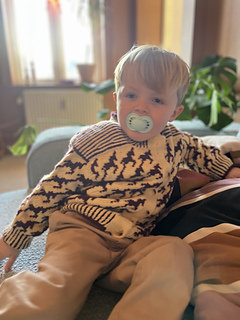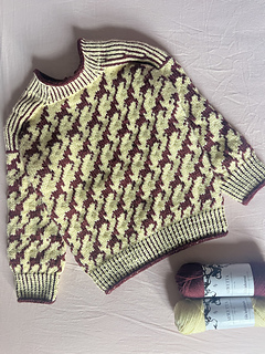 25 masker • 28 pinde i tofarvede rib på hals, ærmer og krop på pind 3,5 mm = 10 • 10 cm