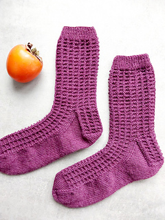 Windows ist eine Anleitung für Socken in acht Größen. Das Strukturmuster erinnert an kleine Fenster, daher der Name. Das Muster setzt sich nach der Ferse an der Oberseite des Fußes fort. Es wird eine verstärkte Ferse mit Hebemaschen gearbeitet.